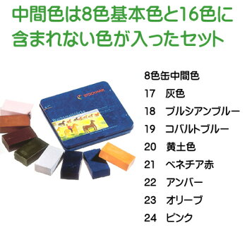 ブロッククレヨン8色缶は基本色と中間色があります。