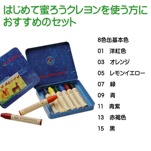 商品名 シュトックマー 蜜蝋クレヨン 8色 メーカー シュトックマー/STOCKMAR 材質 天然みつろう サイズ 缶9.5×10.7×1.6cm スティッククレヨン直径1.2cm×長さ8.2cm 内容物 【スティッククレヨン基本色】01、03、05、07、09、11、13、15 【スティッククレヨン中間色】17、18、19、20、21、22、23、24 【スティッククレヨンアートカラー】25、26、34、42、43、44、45、47 【スティッククレヨンピンク入りセット】01、03、05、07、 09、13、15、24 ※全てのセットにヘラと簡単な使用方法が記載されたリーフレットが付属します。